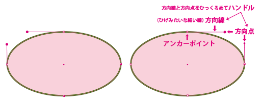 アンカーポイントを選択したときにポイントの両脇に現れる、細いヒゲのような線とその先の点を「ハンドル」と呼びます。ハンドルの先の「方向点」も、ダイレクト選択ツールで動かすことができます。