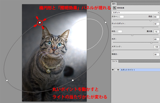 楕円には白くてまるいポイントがついており、このポイントをドラッグして、ライトの強さや場所を選ぶことができます。